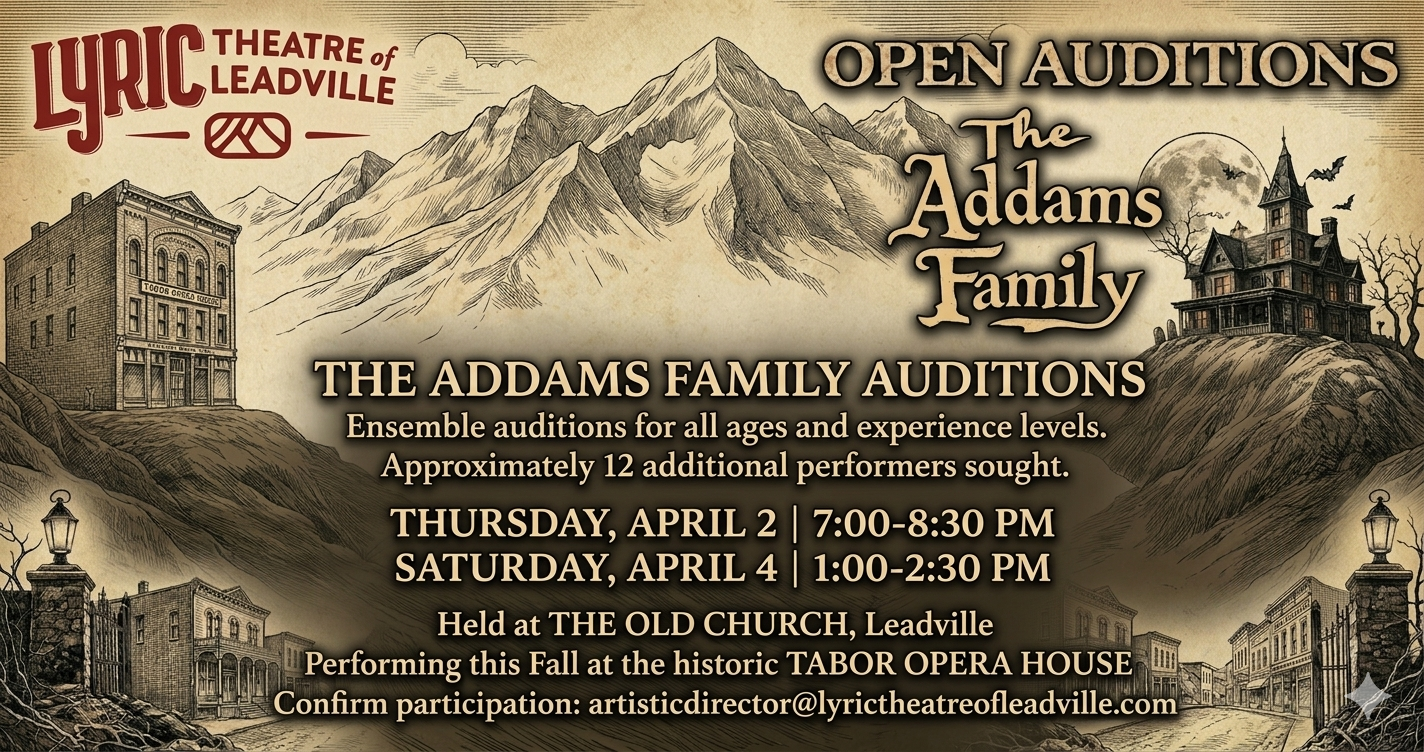 Lyric Theatre of Leadville is excited to continue expanding its role as a creative home for community-driven productions in Leadville. Through a growing season of performances, events, and artistic collaboration, Lyric Theatre of Leadville is dedicated to producing high-quality theatre that reflects and serves our local community. Artistic Director Scott Carroll shares, “I am thrilled to be working with such an incredible group of artists and community members as we build a vibrant season of productions right here in Leadville. Our goal is to create meaningful, accessible theatre that brings people together and celebrates the creative spirit of Lake County.”