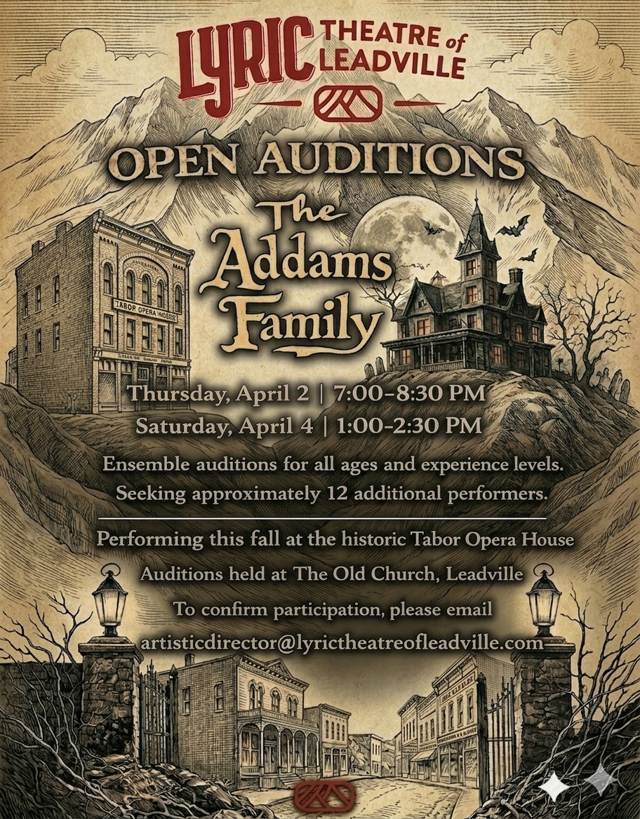 LYRIC THEATRE OF LEADVILLE will hold open ensemble auditions for its upcoming fall production of The Addams Family, scheduled to be performed this fall at the historic Tabor Opera House.